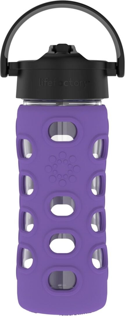 Lifefactory 16-Ounce Glass Water Bottle with Pivot Straw Cap and Protective Silicone Sleeve, Plum