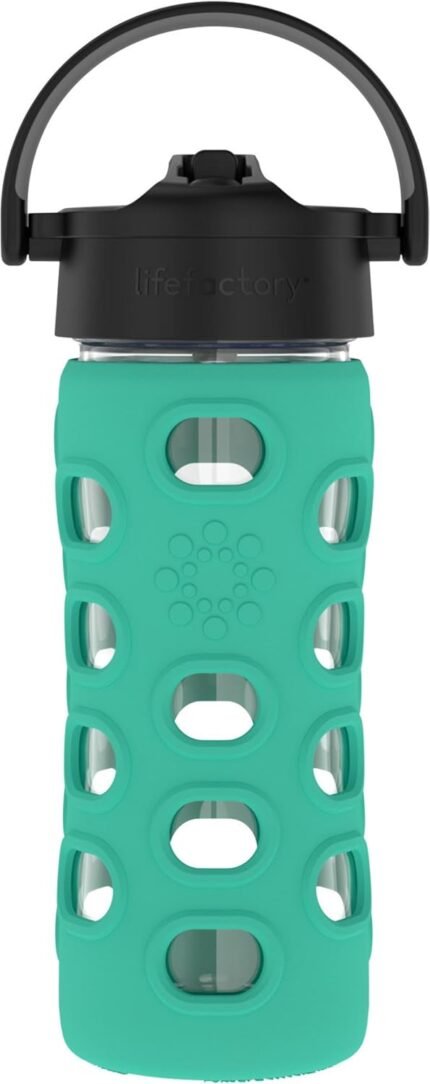 Lifefactory 16-Ounce Glass Water Bottle with Pivot Straw Cap and Protective Silicone Sleeve, Teal Lake