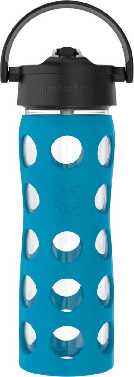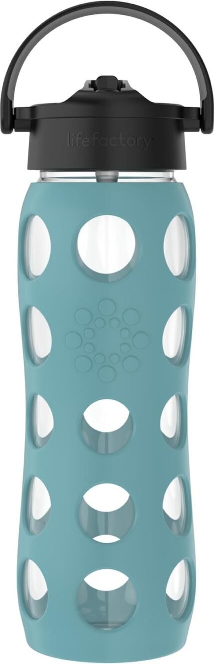 Lifefactory 22-Ounce Glass Water Bottle with Pivot Straw Cap and Protective Silicone Sleeve, Aqua Teal