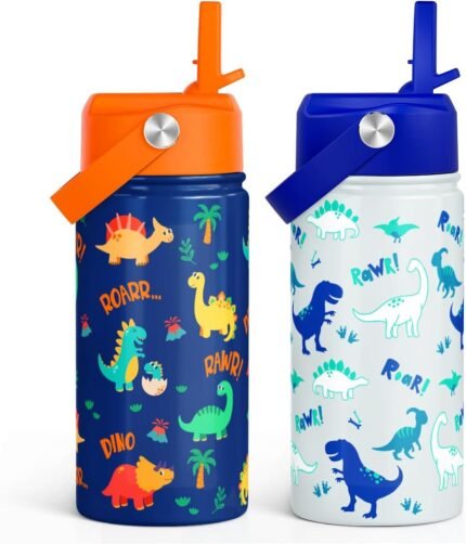 SANDJEST Dinosaur Kids Water Bottle with Straw Lid, Pack of 2 Insulated 12 Oz Stainless Steel Water Bottles for Boys, Travel Cup for School Sports