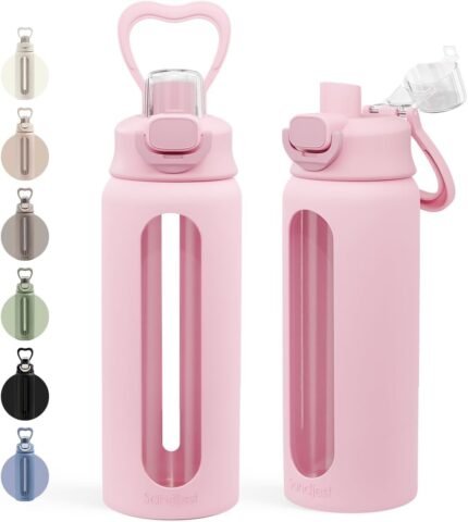 SANDJEST Glass Water Bottle with Silicone Sleeve and Straw Lid 20oz for Girls Women, Glass Drinking Bottles for Travel Home Gym Sports (Rose Cloud)