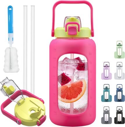 72oz Glass Water Bolttles, 3-in-1 Straw and Sip Spout Handle Lid, Half Gallon Water Bottle with Time Marker and Silicone Sleeve, BPA-Free Sports Water Bottle for Gym, School, Bright Pink