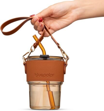 13 oz Tumbler Water Glass, Water Bottle with Straw and Dustproof Lid, Coffee Ice Cup Double Wall Insulated Glass Cup (Amber with Sleeve and Strap)