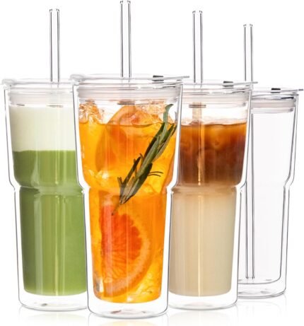 KEMORELA 20oz Double Wall Glass Tumblers 4‑Pack with Lids & Straws | Insulated Clear Drinking Glasses for Iced Coffee, Matcha, Smoothies | Reusable Cups for Family & Parties