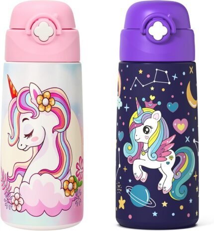 Ntswasd Girls Insulated Water Bottle with Covered Pop-Up Straw,16 oz Kids Cups with Stainless Steel Leak Proof for School(2 pack,Unicorn+Unicorn)