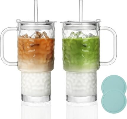 INSETLAN 26oz Ribbed Glass Tumbler with Handle & Lid – 2-Pack Large Iced Coffee Cups with Straws, Modern Glass Mug for Cold & Hot Beverages, Aesthetic Travel Cup for Smoothies, Tea, and Juice