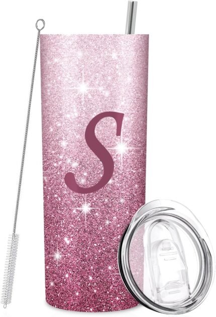 Initial S Tumbler Cup Gifts, Monogrammed Gifts for Women, Personalized Tumblers with Lids and Straws for Women 20oz, Personalized Gifts for Girls Women Mom Teacher Birthday Wedding Graduation, S-Pink