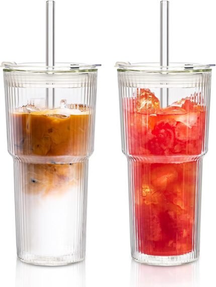 KEMORELA 2-Pack 20 oz Ribbed Glass Tumblers with Lids and Glass Straws – Vintage Iced Coffee Cups, Reusable Smoothie & Cocktail Drinking Glasses, Clear Glassware for Home or Cafe