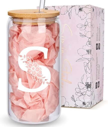 Personalized Gifts for Women, Monogrammed Glass Cups with Lids and Straws, Custom Tumbler, Cute Customized Mug, Aesthetic Stuff, Initial Iced Coffee Cup, Drinking Glasses, Birthday Teacher Gifts, S