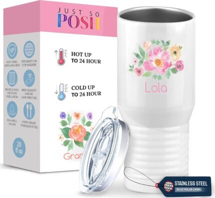 Just So Posh Nanny Flowers Tumbler, Tall Travel Coffee Mug, White 20 oz Polar Camel, Stainless Steel, Vacuum Insulated