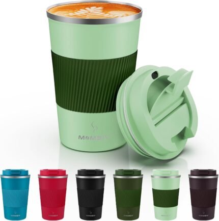 MOMSIV 12oz Travel Mug, Insulated Coffee Cup with Leakproof Lid, Vacuum Stainless Steel Double Walled Reusable Tumbler for Hot and Cold Water Coffee and Tea In Travel and Car (Green-380ml)
