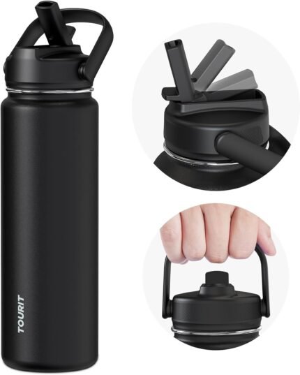 TOURIT 24 oz Insulated Water Bottle, Stainless Steel Water Bottles With Straw, Double Wall Vacuum Insulation for Cold and Hot Drinks, Leak Proof BPA Free Water Flask for Sports and Travel, Black