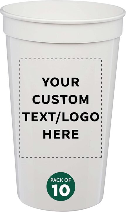DISCOUNT PROMOS Custom Plastic Stadium Cups 22 oz. Set of 10, Personalized Bulk Pack – Perfect for Birthdays, Picnic, Beach, Parties – Translucent White