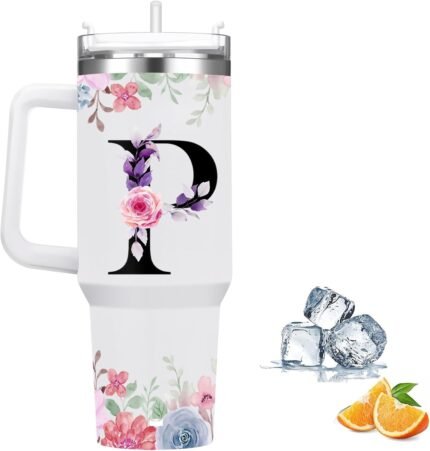 FOLAI Insulated Travel Coffee Mugs, 40oz Steel Water Bottl,Tumbler with Handle and Lid Straw,Thermal Cups for Hot and Cold Drinks Printed with Letters Personalized Unique Gifts for Women and Man(P)