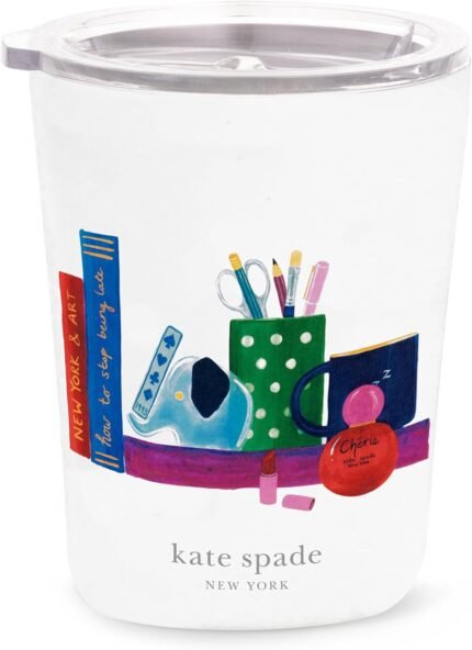 kate spade new york Small Insulated Stainless Steel Tumbler, 12 Ounce Double Wall Travel Coffee Cup with Lid, Charmed Library