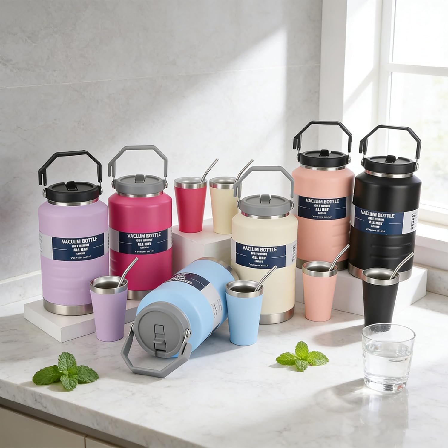 1.5 Gallon Large Insulated Water Bottle + Stainless Steel Cup, 50 oz, Black, 1500 ml Tumbler Jug, Insulated Container, Insulated Jar, 304 SS Thermal Mug, Leak-Proof, Hot/Cold for Sports Travel Gym