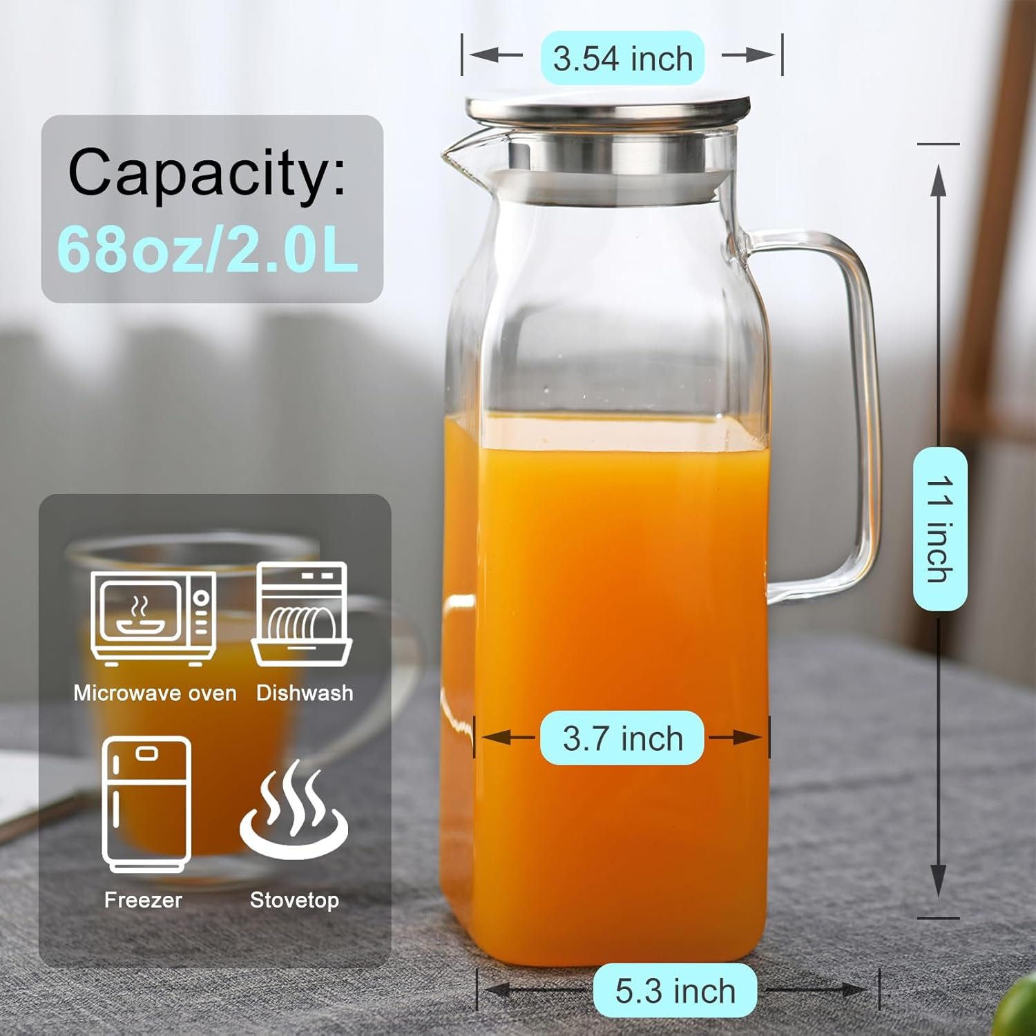Large Capacity for everyday use or parties. You can use our glass pitcher with lid to add some fruit, herbs or vegetables to infuse tasty and healthy water for all-day consumption.Durable and Safe Glass: Made of heat resistant Borosilicate glass and can withstand temperatures -4 to 302 degree F, so you can also use it to hold and dispense hot and cold liquids safely than other materials.