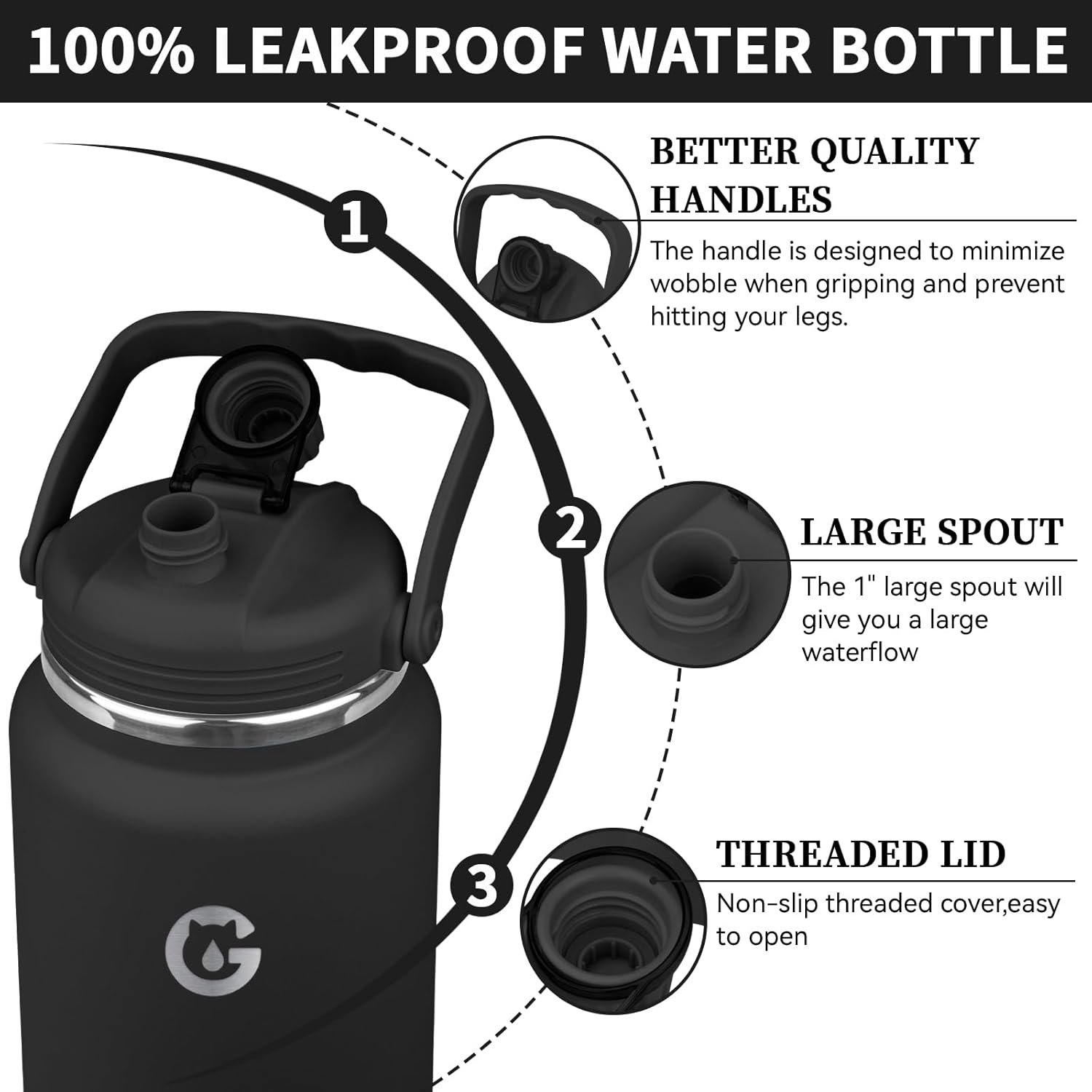 1 Gallon Insulated Water Bottle with Handle, 135 oz Double Vacuum Stainless Steel Water Jug for Hot & Cold Drinks, Leak-Proof Large Wide Mouth Water Flask for Travel, Gym, Biking (Black)