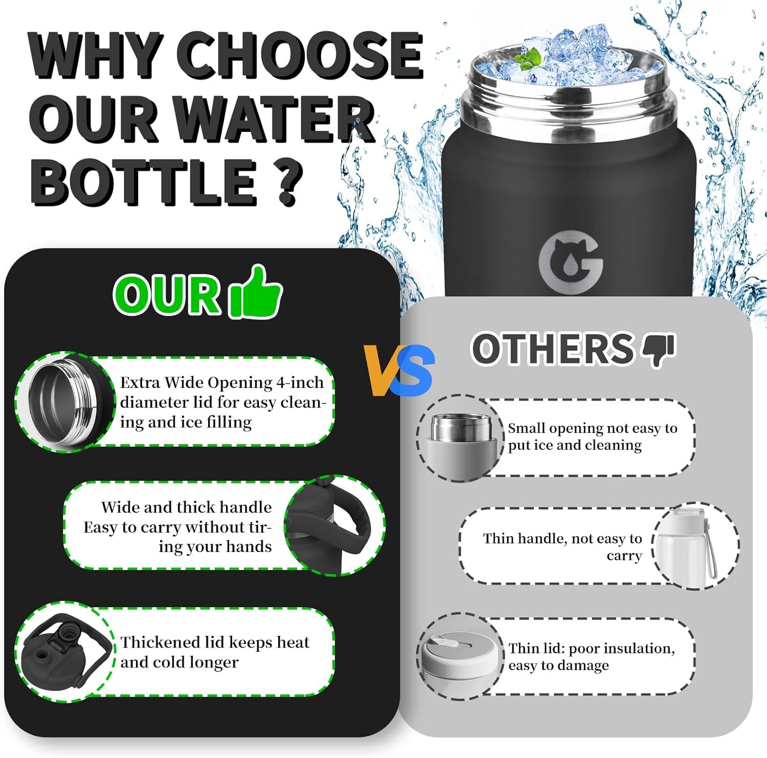 💧 Humanized Detail Design: 1 inch wide ergonomic large handle, filled with water can also be easy to hold and carry; 4.4 inch large opening is easy to clean, but also can put ice cubes to quickly make iced drinks. The combination of sturdy materials and portable design makes it easy to handle both outdoor adventures and home use.
