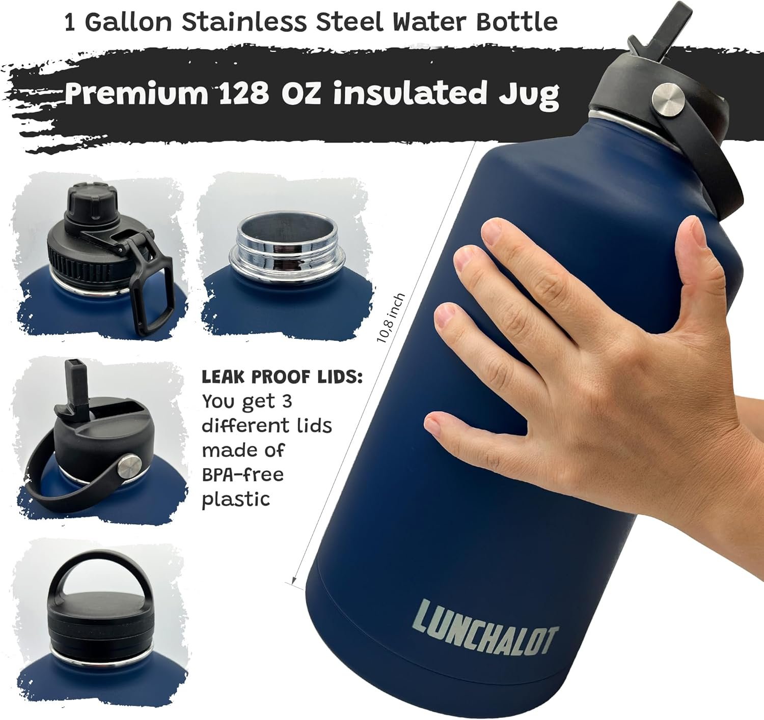 GALLON WATER BOTTLE: Blue reusable water jug is made of 304 stainless steel; Enjoy your favorite beverage no matter where you are and keep them fresh for a long time; 128 oz water bottle is a great way to push yourself to drink more water every day