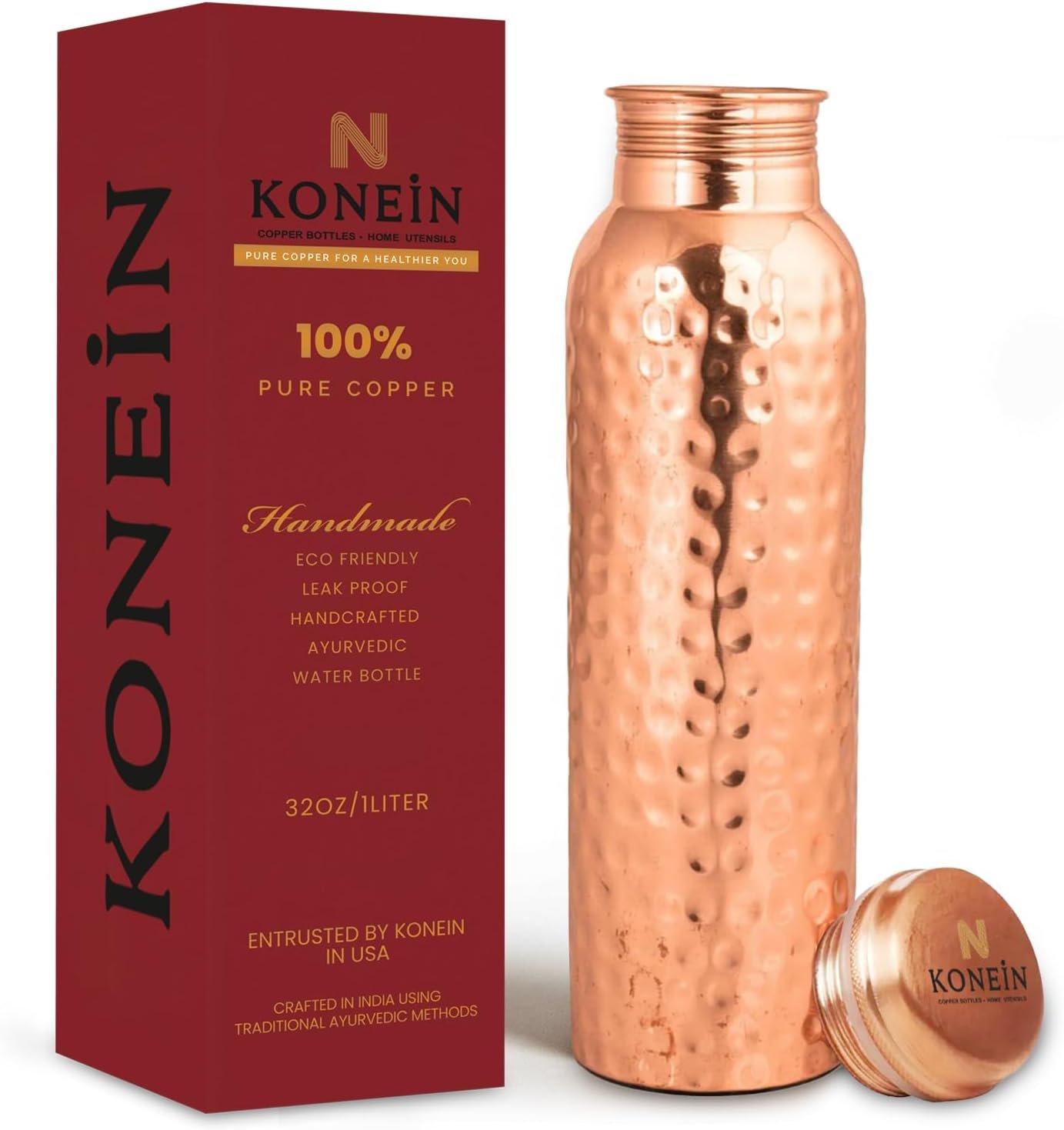 100% Copper Water Bottle, Hammered Finish Design, (34 Oz/1000ml), Ayurvedic Copper Bottle for Drinking water with Nature Health Benefits, Leak-Proof, Durable & Eco-friendly