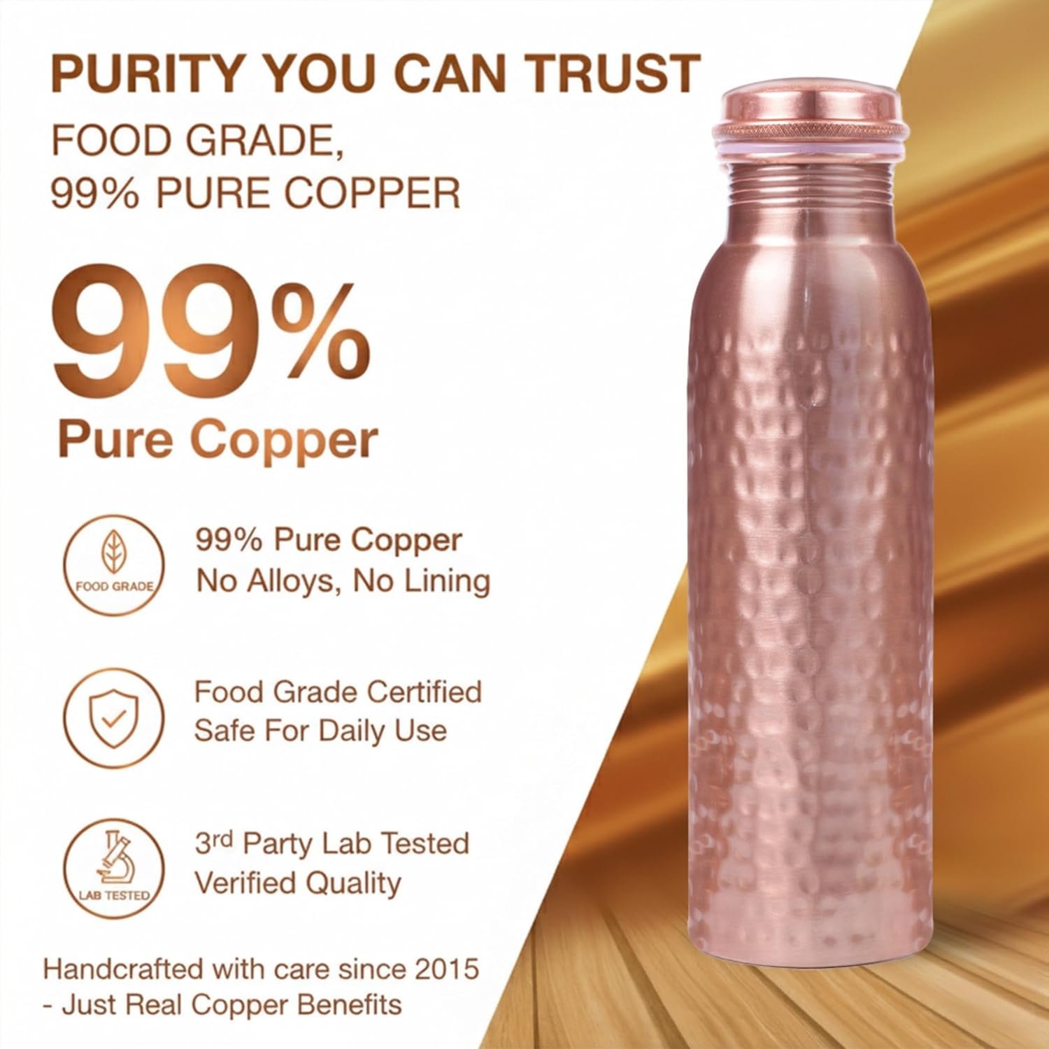 ✔️ 100% Pure Copper Bottle – No Lining or Coating Made from high-quality, food-grade copper for maximum Ayurvedic health benefits. No plastic, no steel, no compromise—just pure copper.