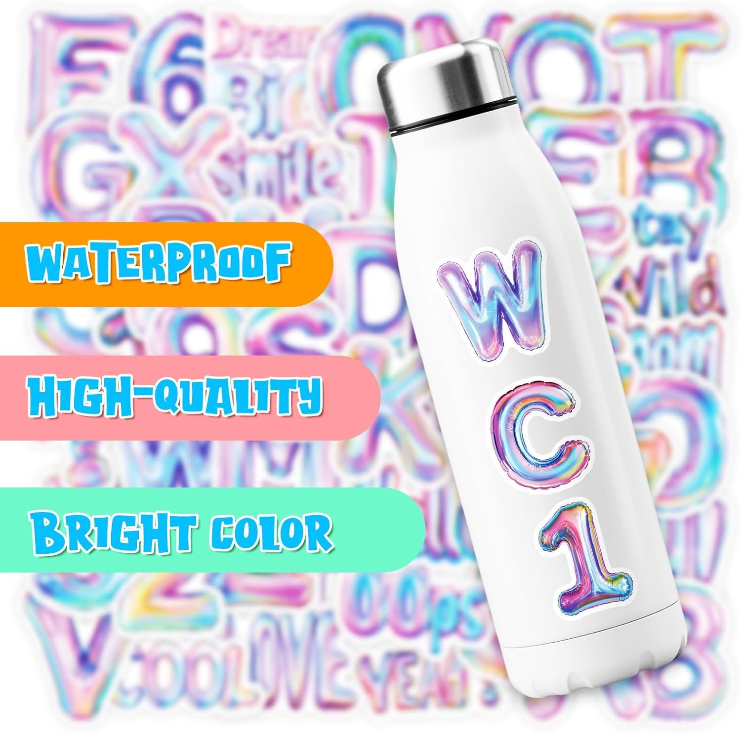 These shimmering vinyl letter stickers add a stylish and playful decorative touch to water bottles, laptops, tumblers, journals, and planners. Featuring balloon-style letters, number stickers, and decorative word designs, this set is ideal for personalized decoration and creative DIY projects.