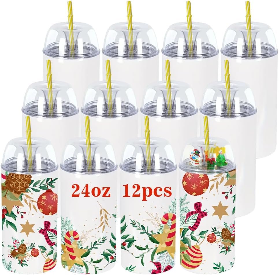 12 Pack 24 oz Sublimation Tumblers with Dome Lid and Straw Double Wail Stainless Steel Vacuum Insulated Blank Tumbler with Curved Cover for Christmas DIY Cups