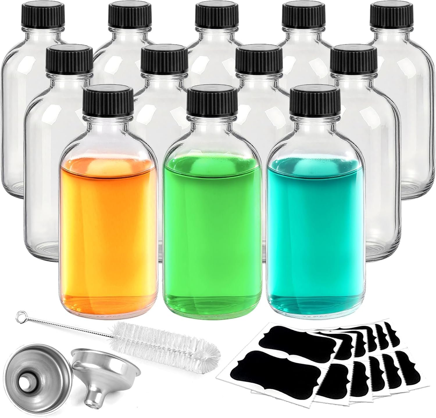 【Packaging Includes】12 2oz (60ml) clear glass bottles, 12 waterproof label papers, 2 stainless steel funnels, and 1 cleaning brush. The mini glass bottles are packaged in a thick cardboard box with grid-like partitions to prevent damage from collisions during transportation.