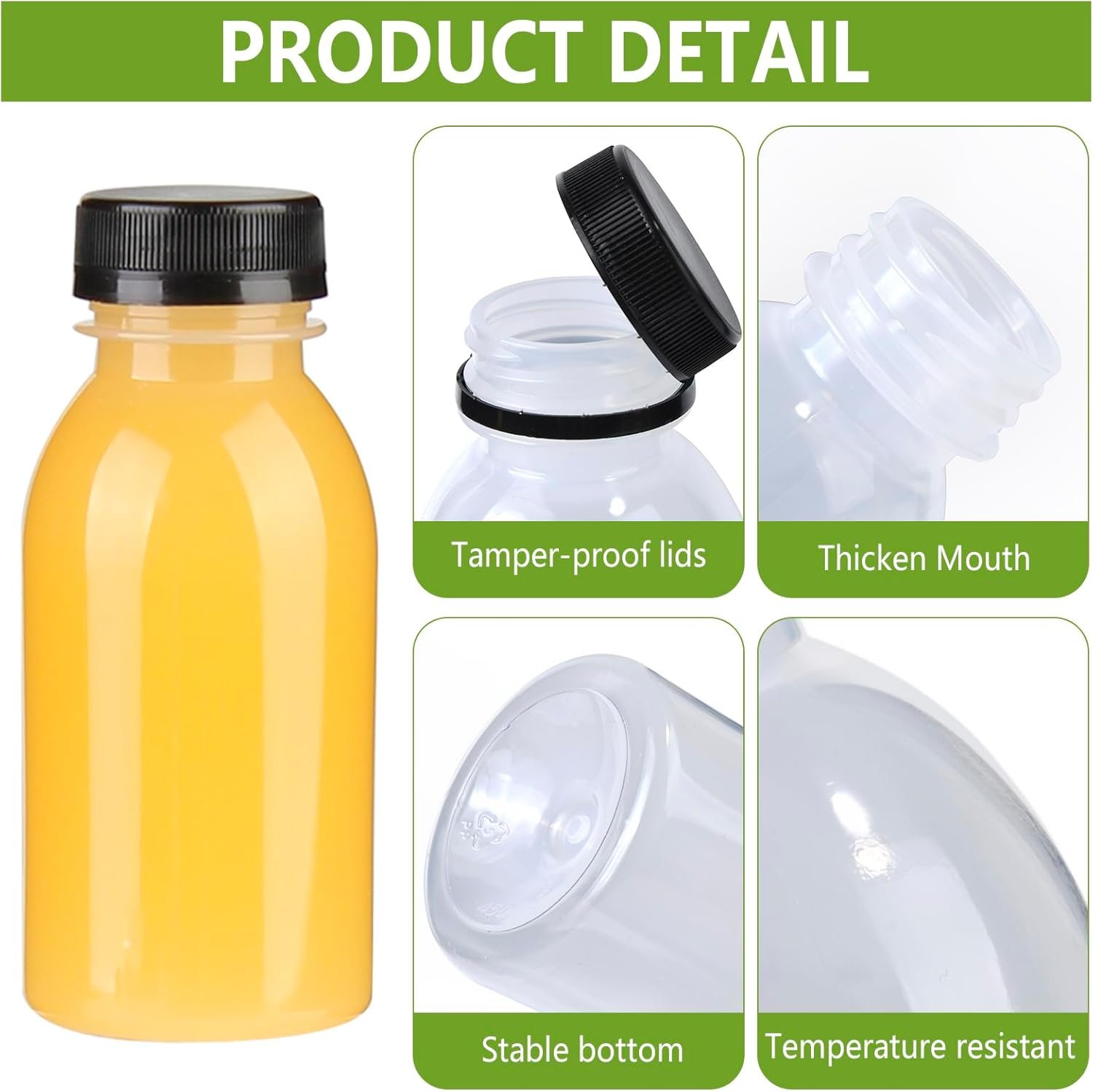 Package included: 12 Pack 8 oz (250 ml) PP plastic juice bottles with tamper-evident lids. Portable for kids use
