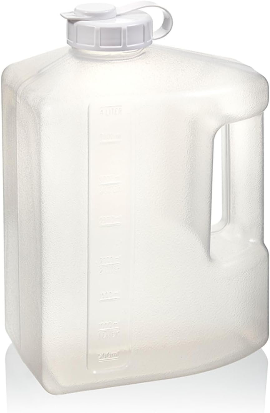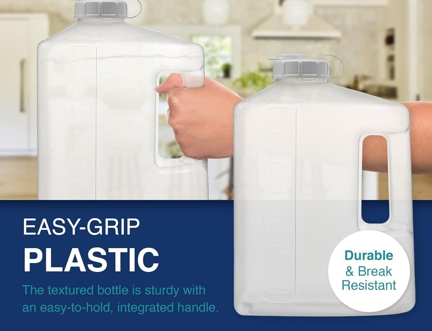 1 gallon refrigerator bottle. This refrigerator bottle is ideal for mixing and chilling. Perfect for iced tea, juice, and flavored water. Graduated markings in ounces and liters. BPA-free / food-safe materials. Made in the USA. Leak proof- cap with easy pour spout. Stain-resistant. Natural body with white top.