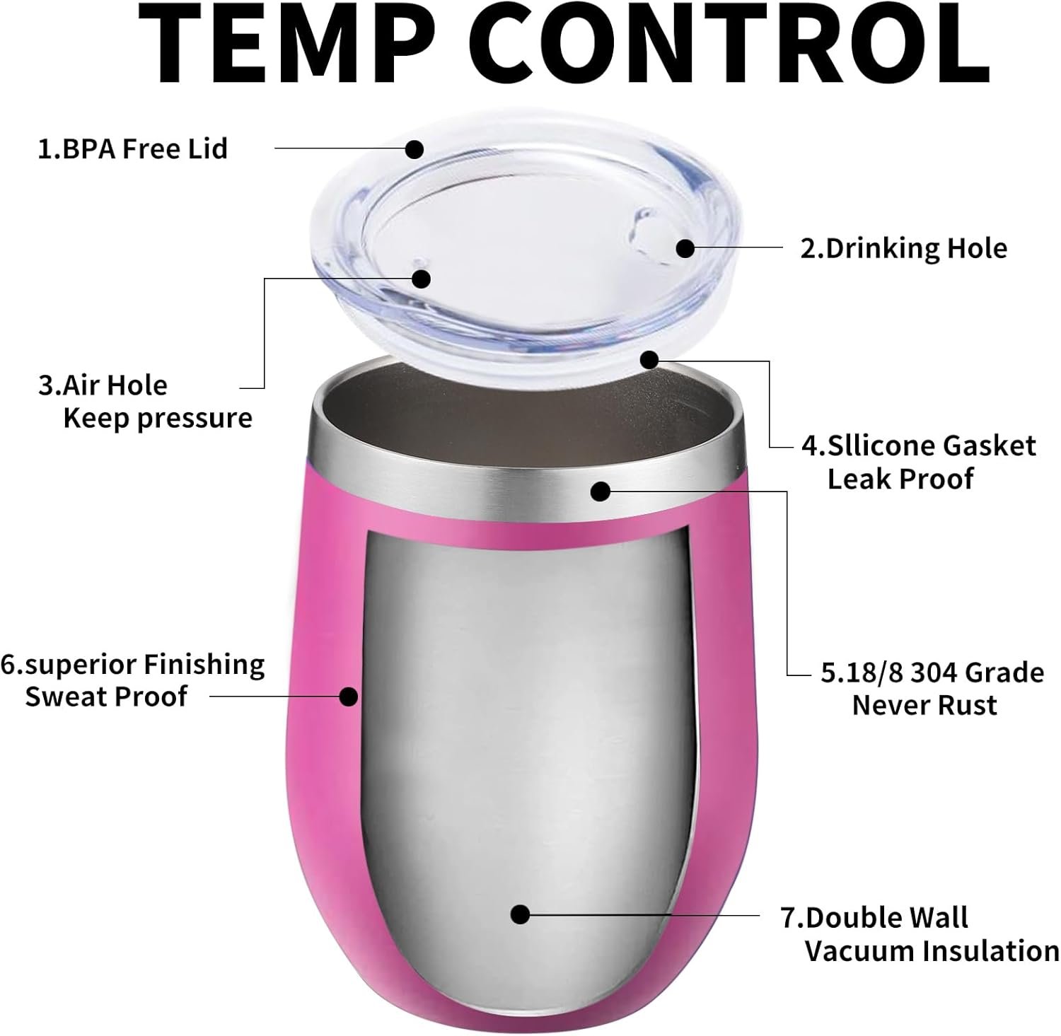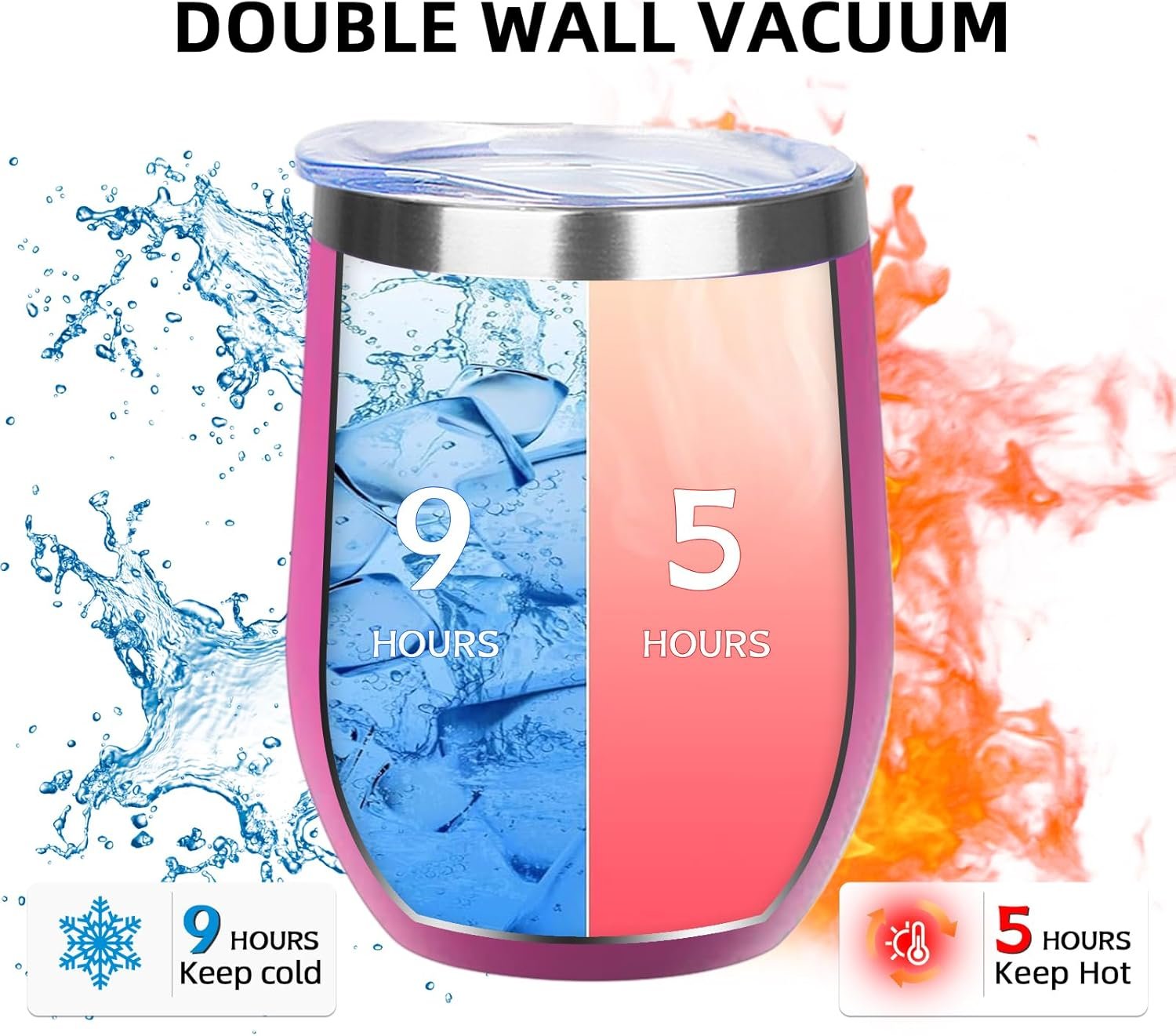 [Double wall insulated wine tumbler]: The double wall technology of vacuum wine tumbler make it possible that keeping the drink hot up to 3 hours or cold up to 9 hours. The advanced structure help you take a hot coffee in a work day the mild taste warms your stomach;You will have a comfortable feeling,High-quality stainless steel material can keep the stainless steel wine tumbler surface dry all the time,It is a great choice to take the iced drink with wine tumbler when you make fun outdoor.