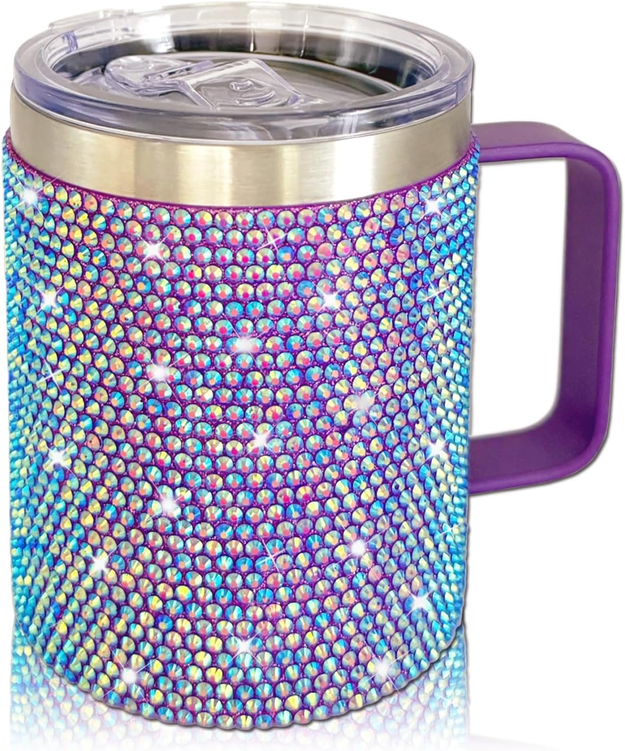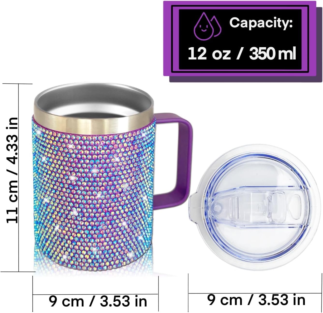 Adequate Capacity,Comfortable Grip:This bling 12 oz coffee mug is compact and portable, features a shiny diamond anti-slip coating and wide handle designed for comfortable finger grip