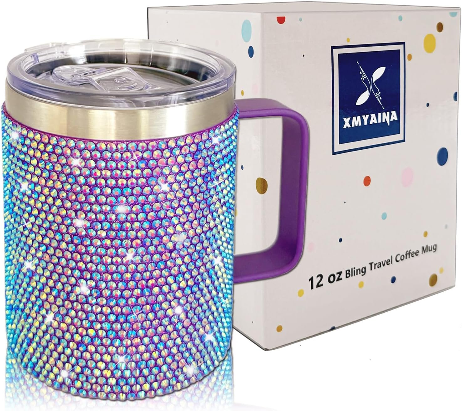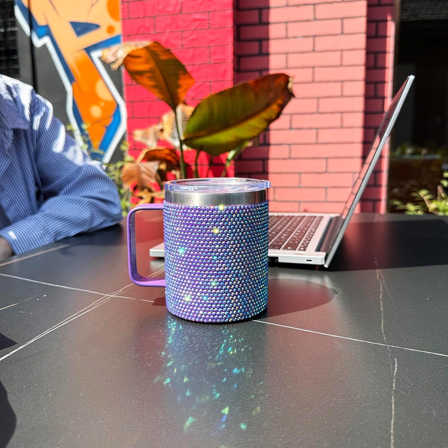 12oz Bling Travel Coffee Mug with Handle and Lid Rhinestone Insulated Coffee Mug Stainless Steel Vacuum Reusable Glitter Coffee Tumbler Thermal Cup for Home and Office (Purple)