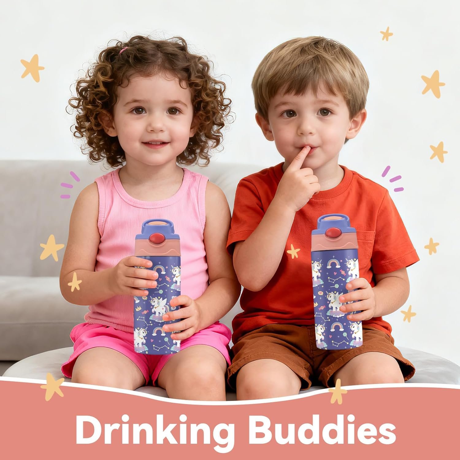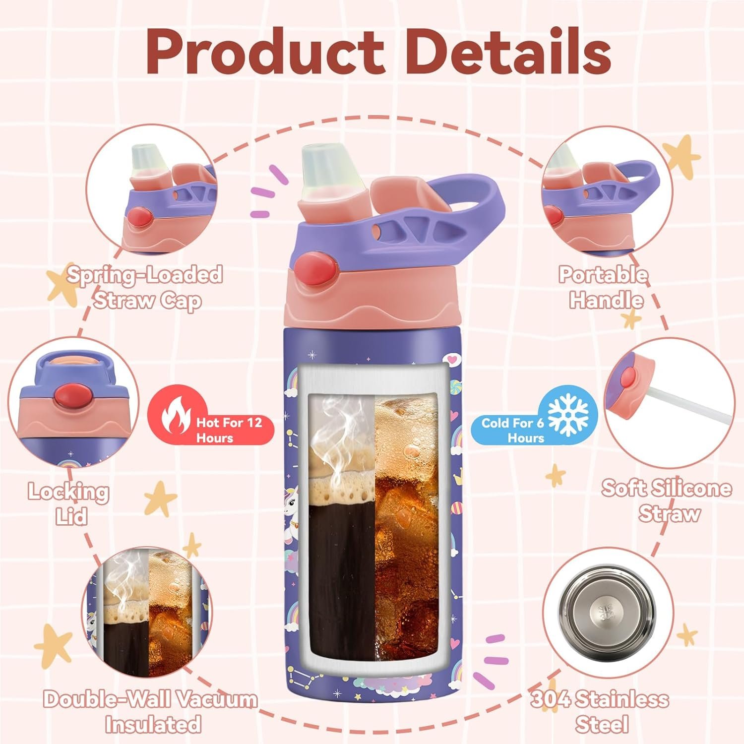 🌈【Perfect Size for School Days】This 12oz kids water bottle for school is designed specifically for children’s needs. The compact size fits perfectly in lunch boxes and backpack pockets, while the lightweight construction makes it easy for small hands to carry. Its practical capacity provides just the right amount of hydration for classroom activities and outdoor adventures.