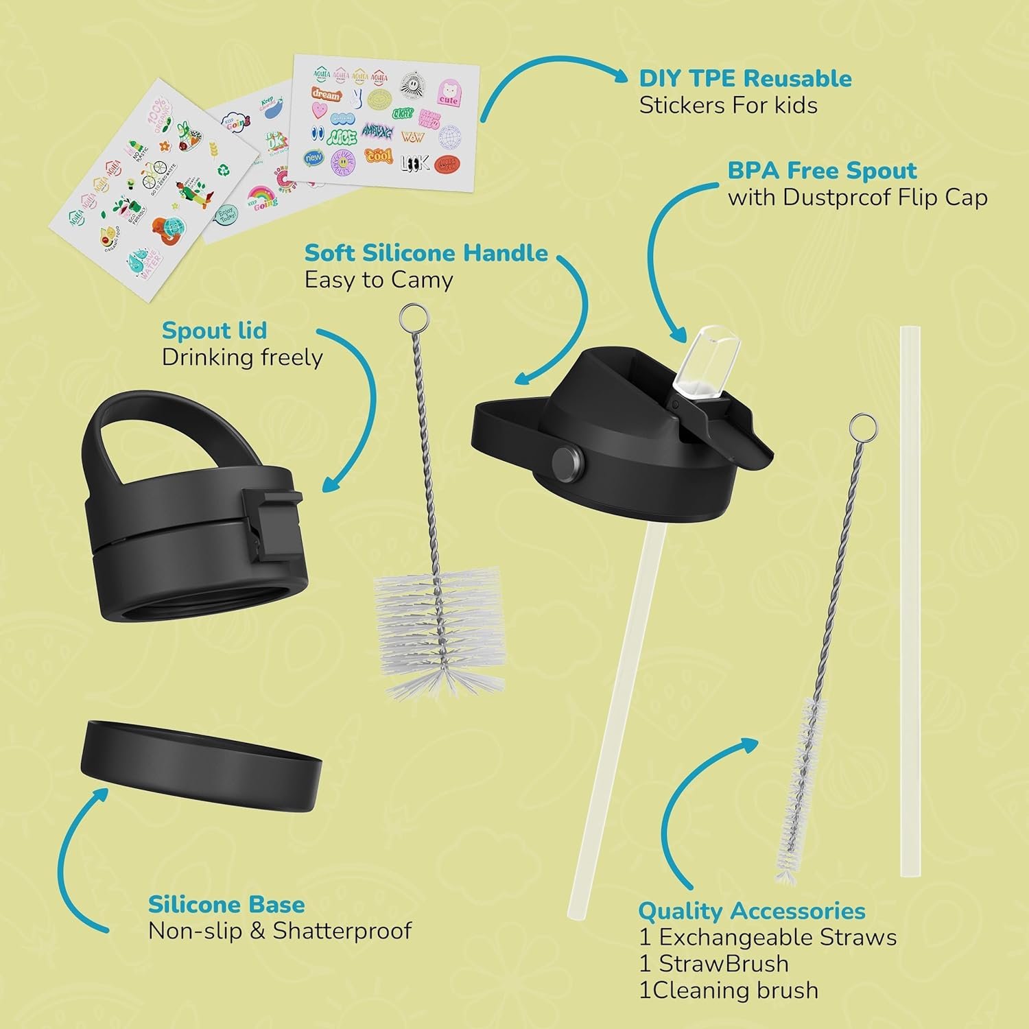 Dual-Purpose Lids: The AOHEA kids’ water bottle has both a straw lid and a chug lid, each equipped with handles. Their user-friendly opening mechanism is tailored for small hands, allowing children to comfortably sip or take quick gulps according to their preference. Rest assured, when correctly closed, it’s 100% leakproof and spill-proof, preventing any unwanted messes.