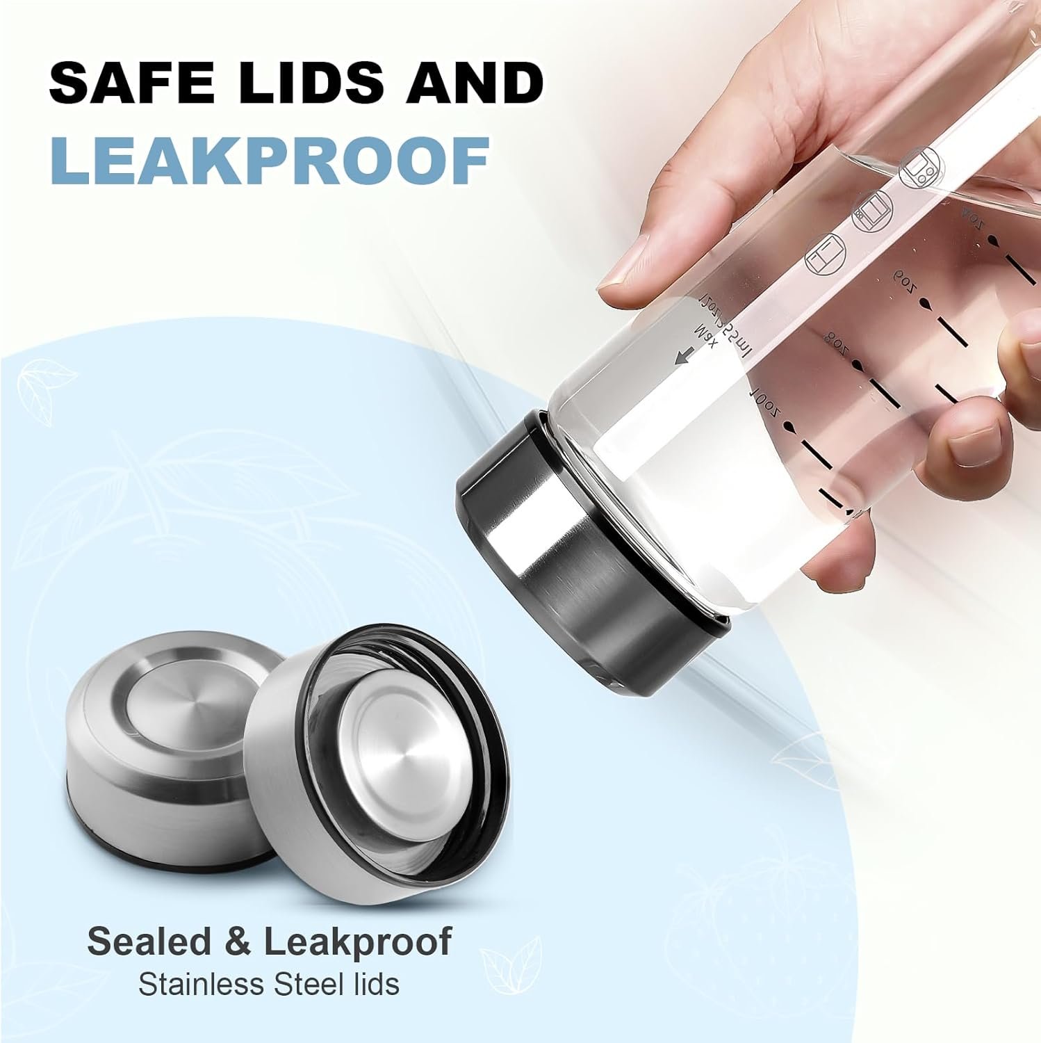 [LEAK PROOF & AIRTIGHT STAINLESS STEEL LIDS] Our glass bottles feature airtight stainless steel lids that keep liquids securely sealed, each cap is lined with a rubber O-ring so it will never leave a leaky mess in your car or bag. Oxygen can’t get in to break down the enzymes and ruin your juices.