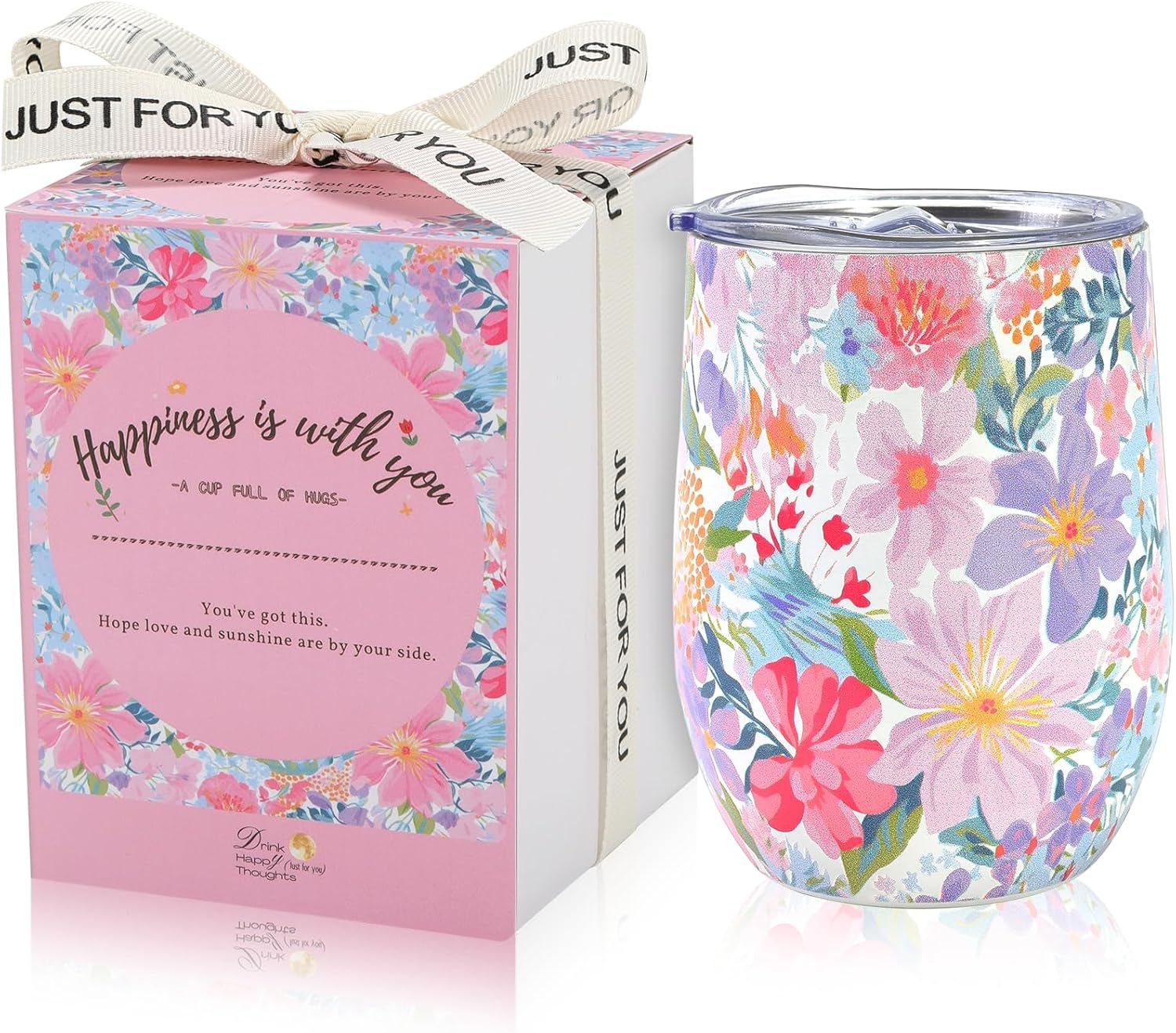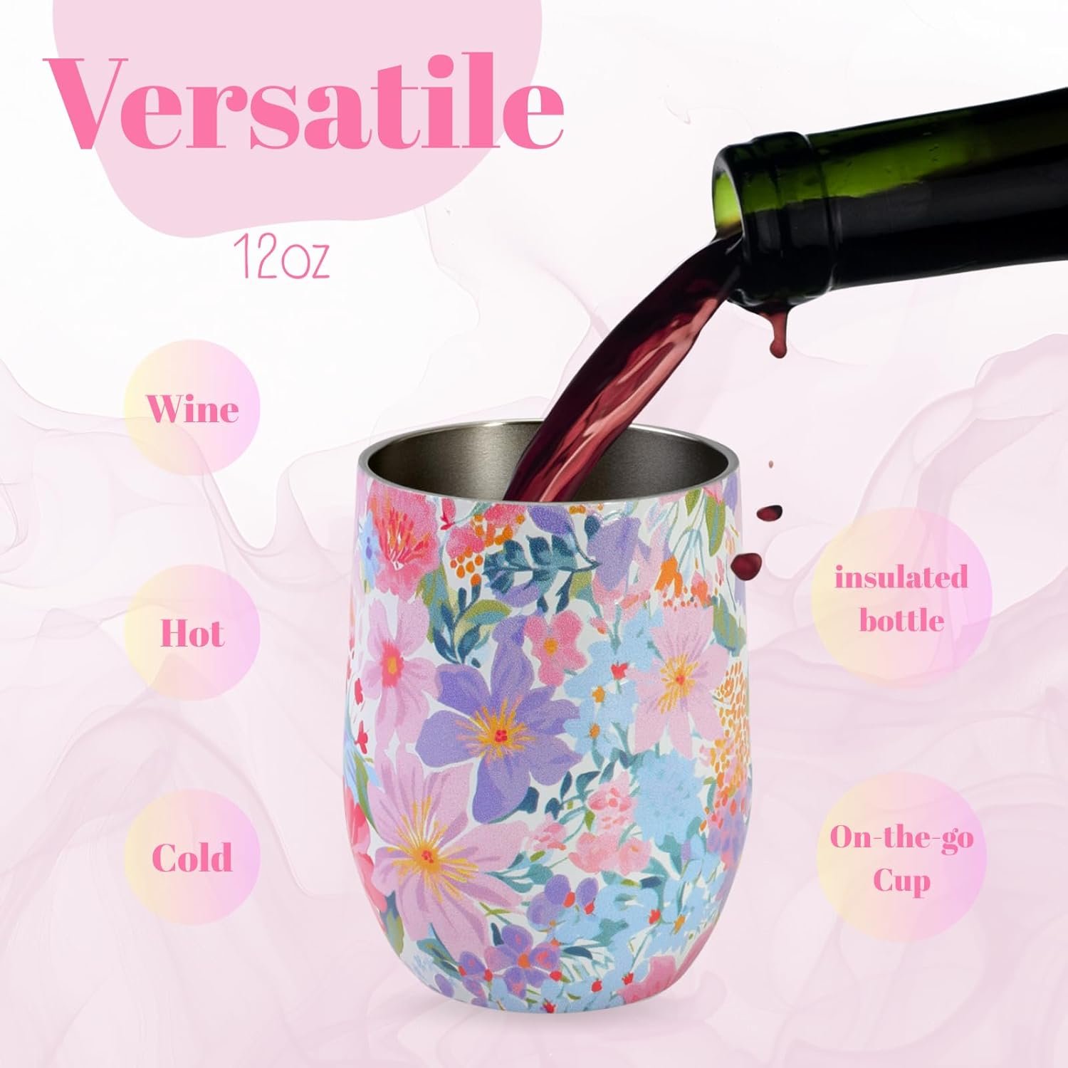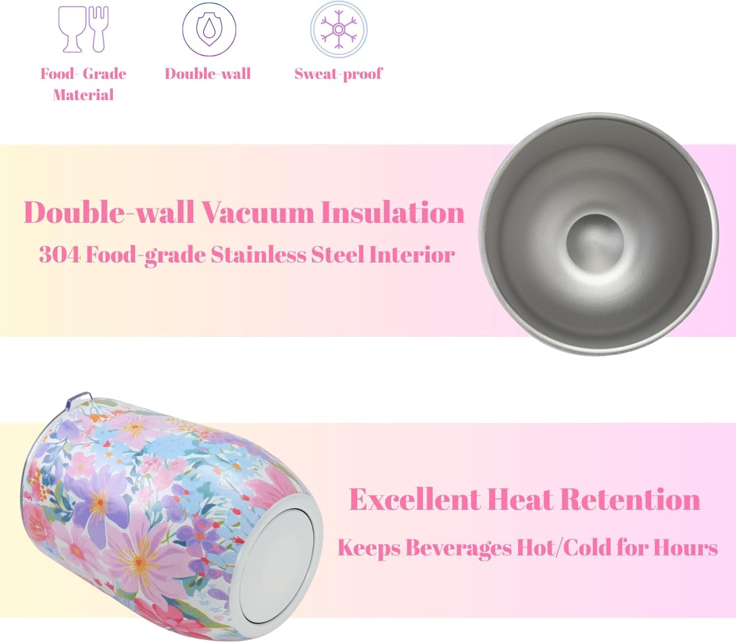 12oz Vacuum Insulated Wine Tumbler, Stainless Steel Flower Cup with Lid, Womens Birthday Friendship Christmas Gifts for Friend Coworkers Mom Teacher Sister Girlfriend Her Unique