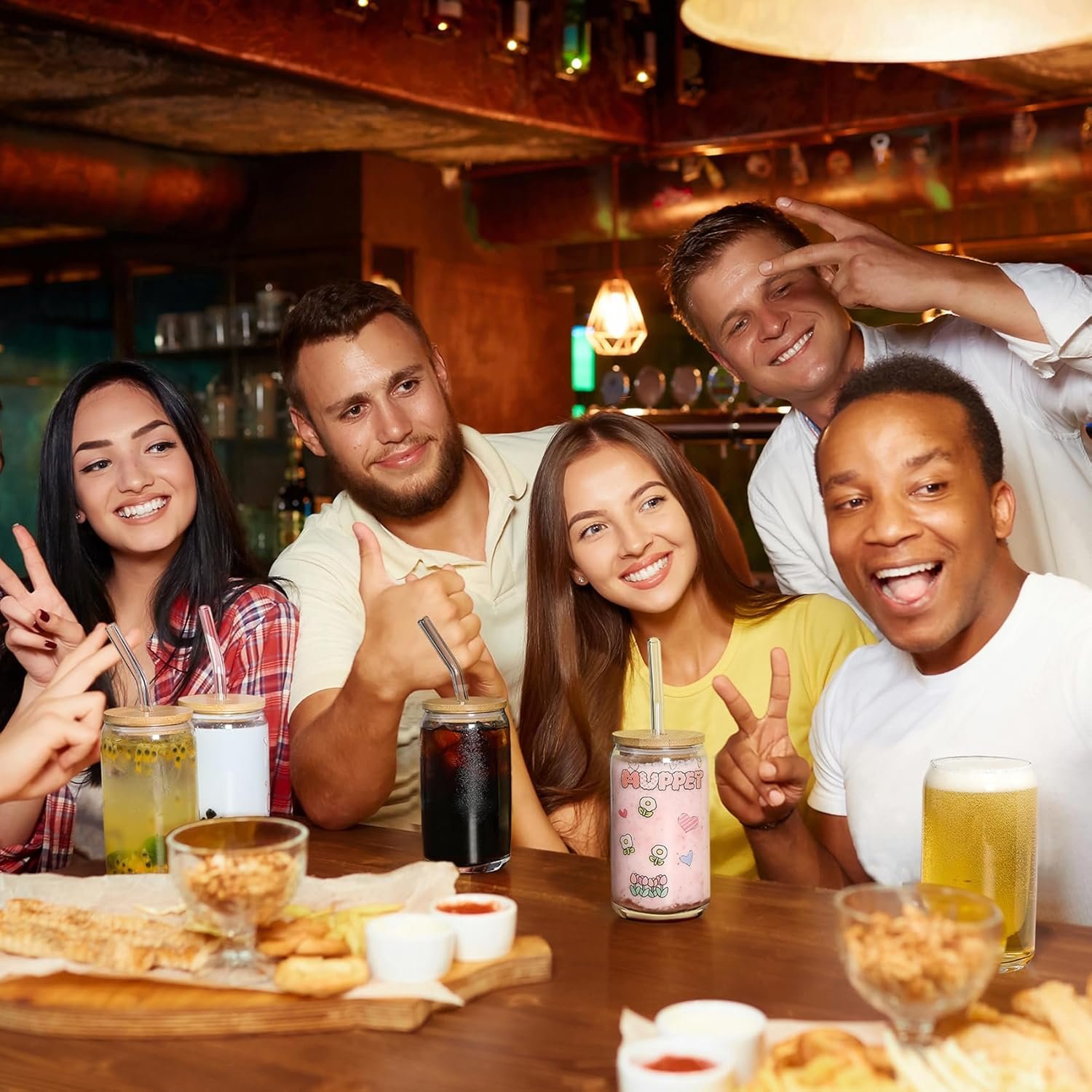 [ 12pcs Set ] Glass Cups with Bamboo Lids and Glass Straw – Beer Shaped Drinking Glasses, 16 oz Iced Coffee Glasses, Cute Tumbler Cup for Smoothie, Boba Tea, Whiskey, Water – 4 Cleaning Brushes