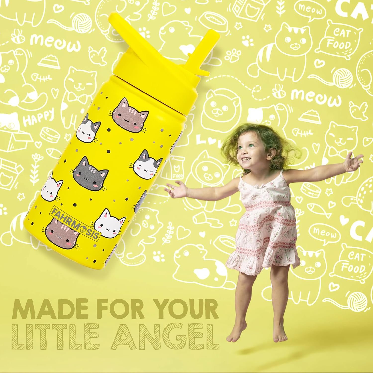 14 OZ Kids Water Bottle with Straw & 2 Lids (Flip & Spout) Leak Proof Metal Insulated Stainless Steel Reusable Tumbler for School & Sports Water Bottle – Yellow (Cat)
