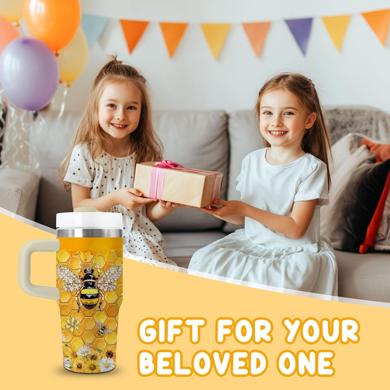 14oz Bee Tumbler with Handle, Stainless Steel Insulated Cup with Lid and Straw Personalized 14 OZ Bee Tumblers Gifts for Women Men