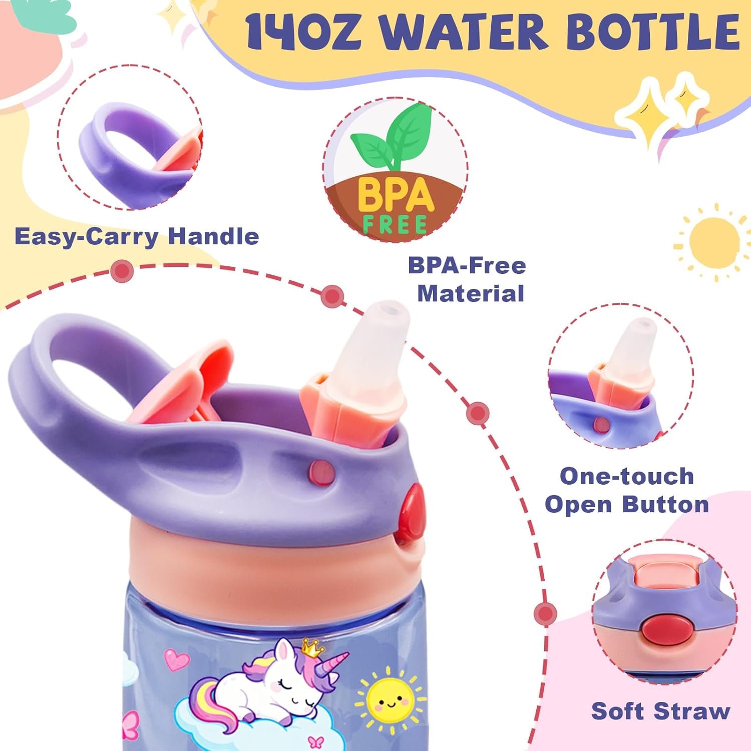 【Premium Material】This 14oz kids water bottle is made of high-quality plastic, BPA-free, and comes with a straw. It’s shatterproof, lightweight, and durable—perfect for kids to stay hydrated at school, during outdoor activities, or at home.
