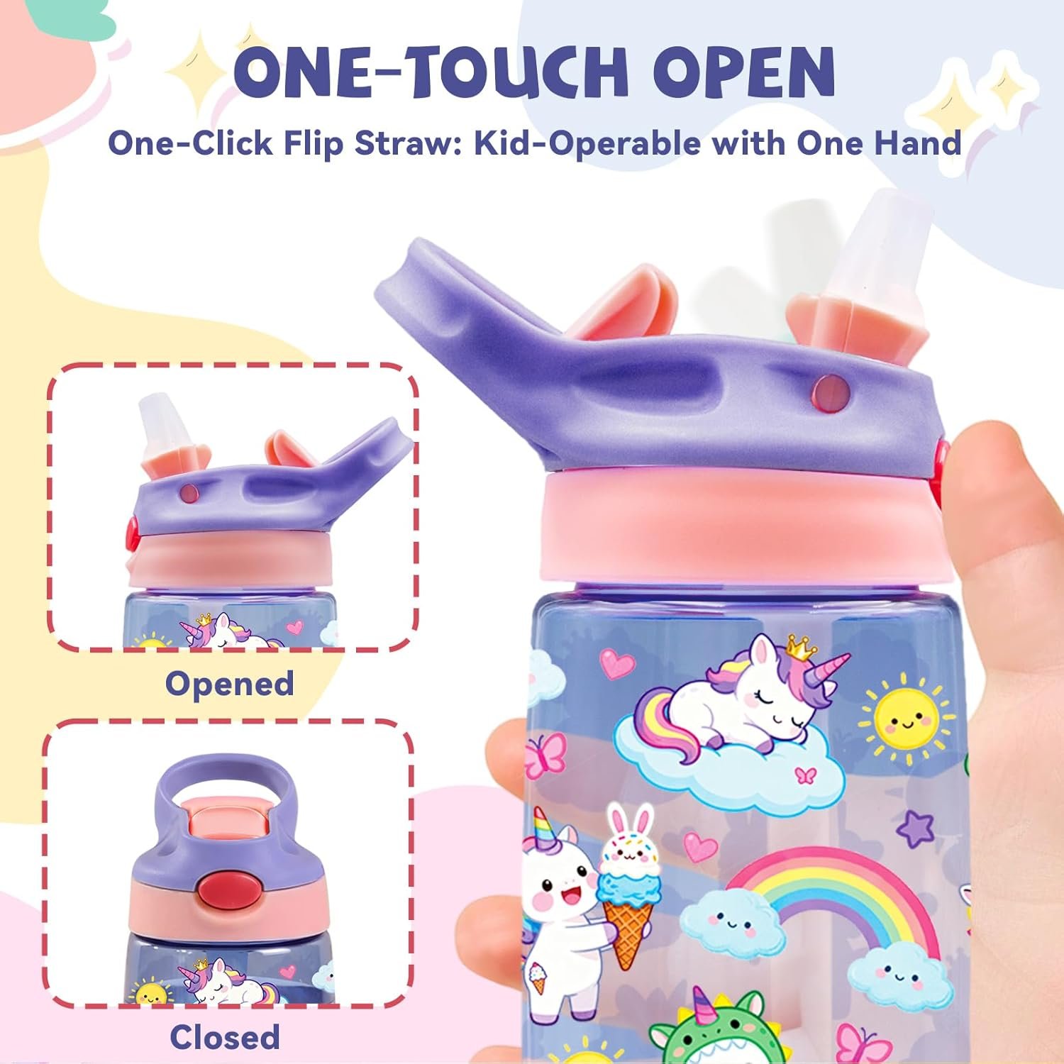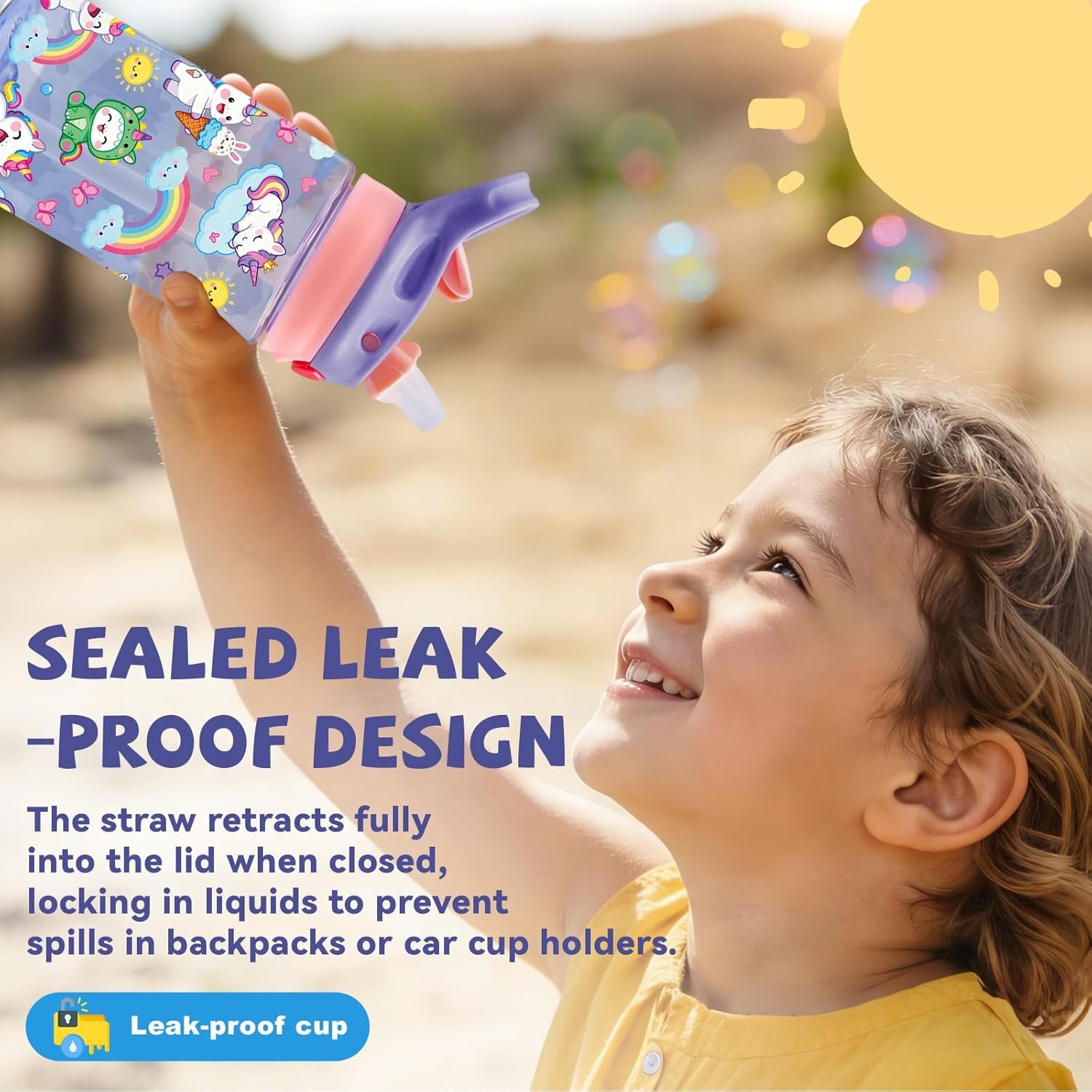 【Leak-Proof Straw Lid Design】Equipped with a safe, leak-proof straw lid, kids can simply press the button to pop up the straw and drink easily—they’ll love the one-handed, one-click sipping experience.