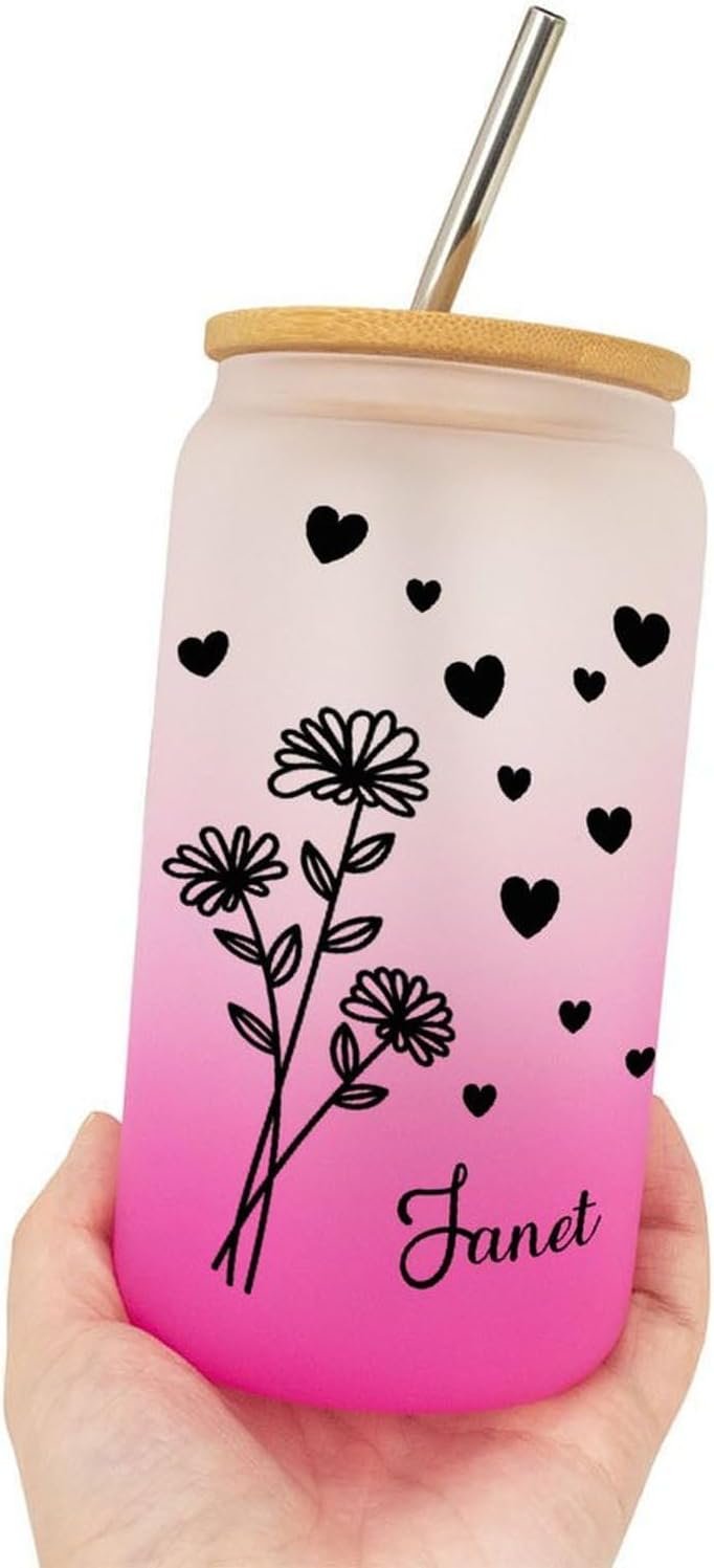 16 Oz Can Glass Cup Customized Birth Flower Glass Water Bottle with Bamboo Lid And Straw – Reusable Water Cups Glass Tumbler W/Lids Straws – Valentines Day Gifts for Women