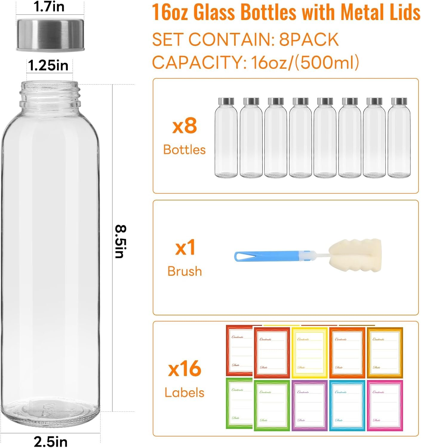 16 oz Clear Glass Water Bottles with Leakproof Lids 8 Pack,16 oz Glass Bottle for Juicing,Reusable Water Bottles with Stainless Steel Airtight Caps for Work, GYM, Home