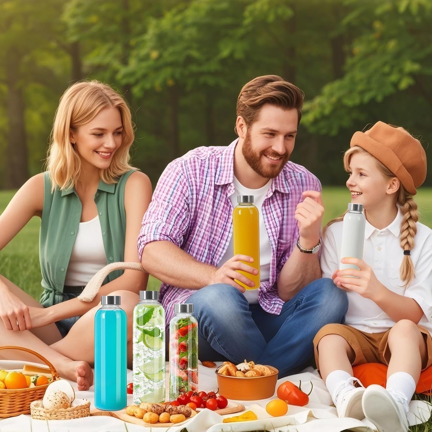 Tight-Seal Stainless Steel Lids: Each glass water bottle is paired with a stainless steel lid, featuring a silicone O-ring that provides a snug fit over the bottle opening; This design ensures no leaks and prevents air infiltration, keeping your beverages fresh and pure