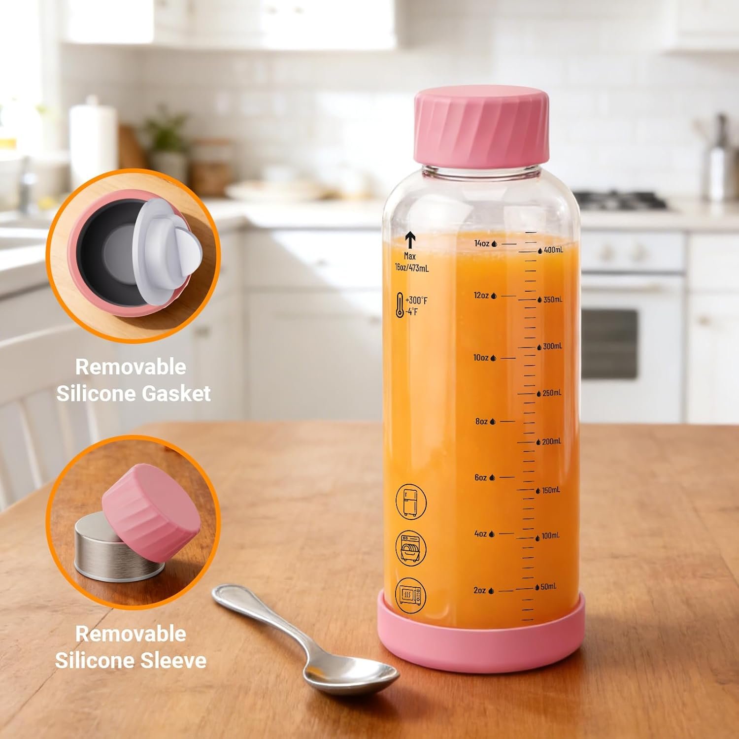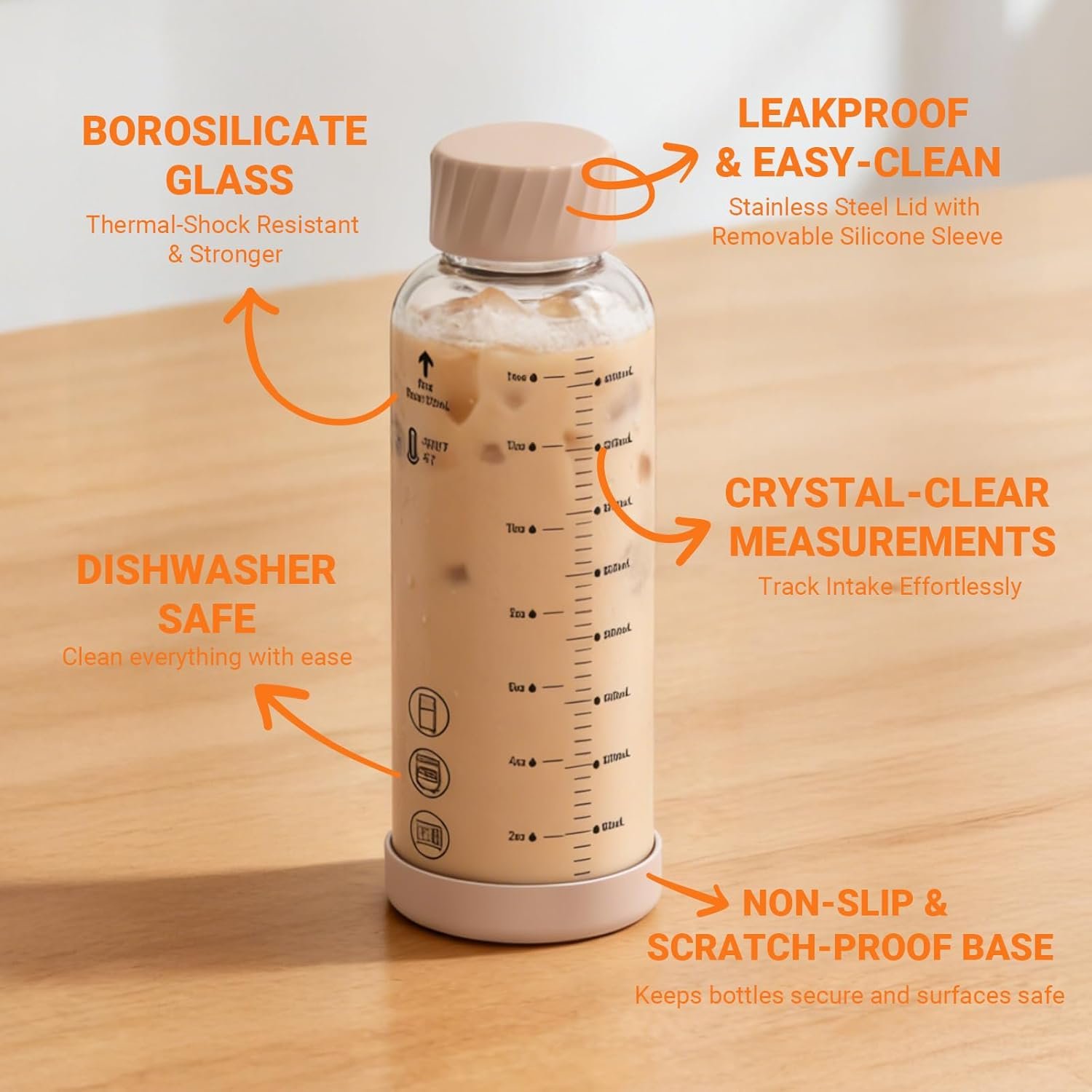 【Stable Silicone Base & Leak-Proof Lid】Each glass juice bottle features a non-slip silicone base pad that prevents sliding, protects surfaces from scratches, and absorbs minor impacts. Paired with the stainless steel leak-proof lid, your drinks stay securely sealed and upright whether you’re commuting, outdoors, or storing in the fridge