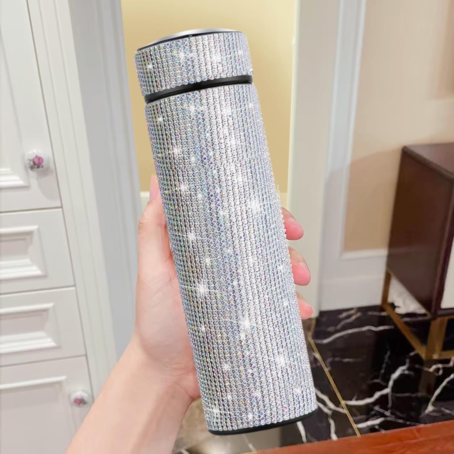 17 oz Bling Stainless Steel Water Bottle LED Temperature Display Smart Rhinestone Vacuum Water Bottle Glitter Bottles Diamond Vacuum Flask Mug Gift Girls Women (500ml),AB