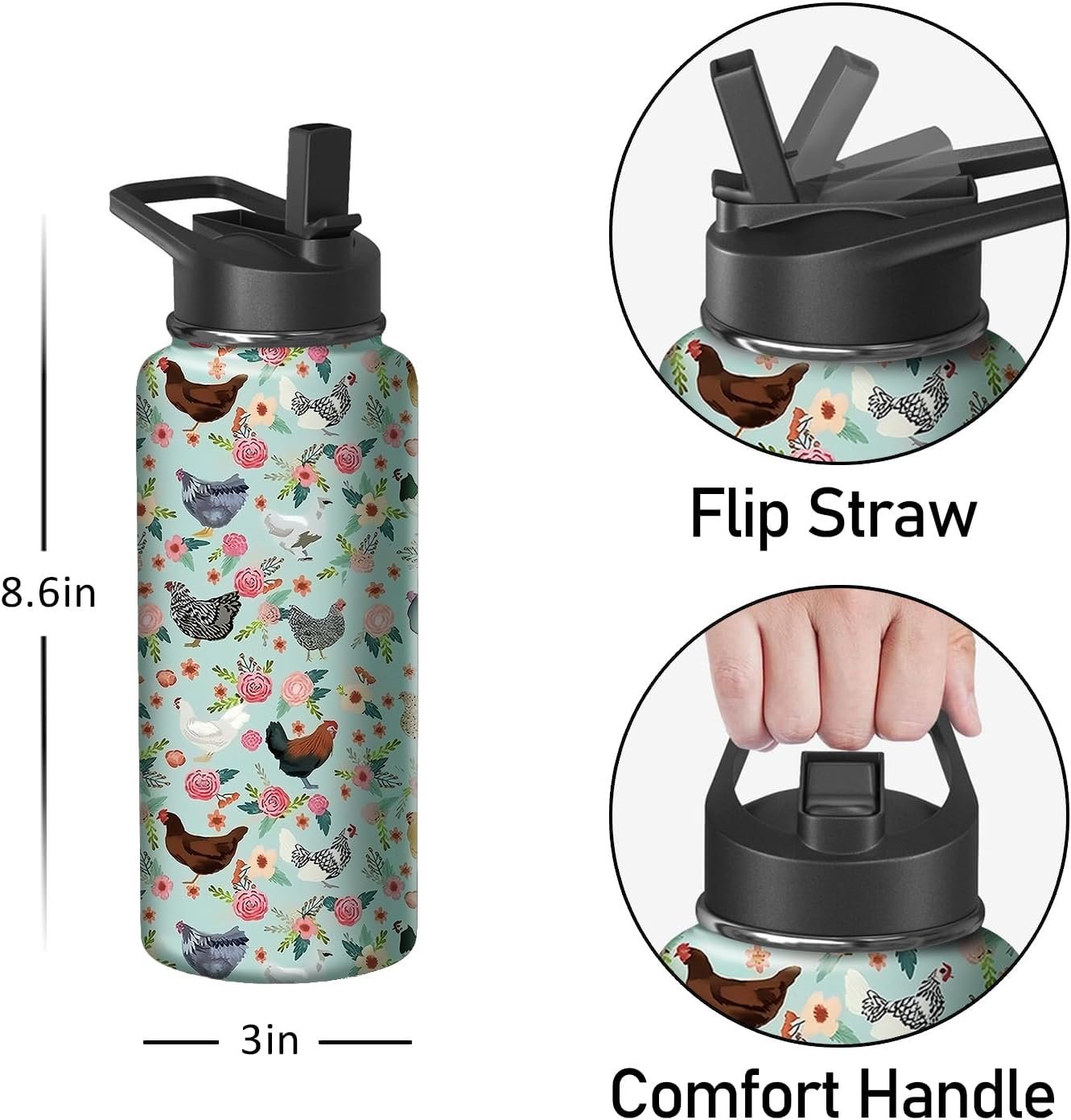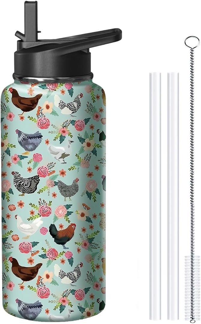 18oz Chicken Water Bottle with Handle and Flip Straw, Animal Sports Stainless Steel Insulated Cup Travel Coffee Mug Tumbler, Birthday Mothers Day Chritmas Gifts for Women