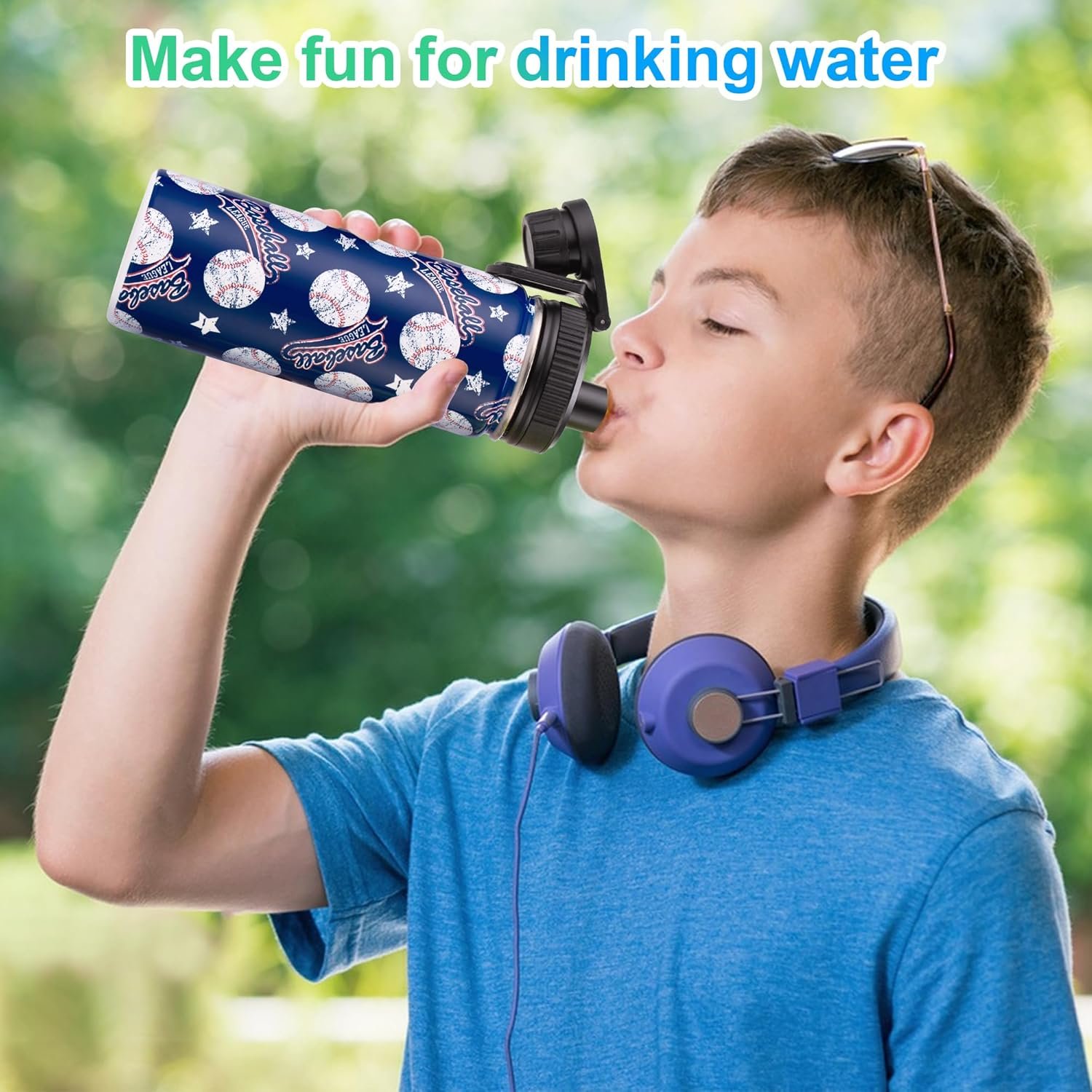 18oz Insulated Water Bottle with Straw Lid & Spout Lid, Baseball, Gift for Kids Boys to School Sports Travel Fitness Hiking Outdoors, Double Wall 18/8 Stainless Steel, Hands Wash Only, Blue